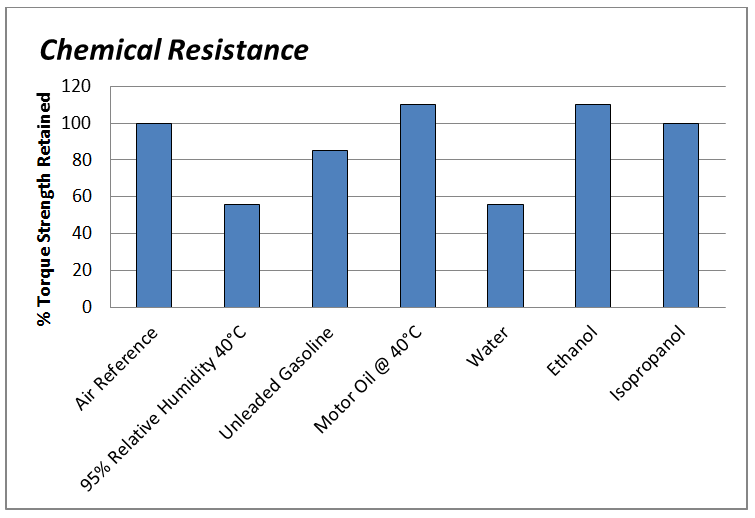 Single component epoxies are very resistant to a variety of chemicals. They are often selected for the high durability under extreme conditions. The chart below percent strength retention of typical single component epoxies when exposed to various chemicals for 30 days at 85°C (185°F).