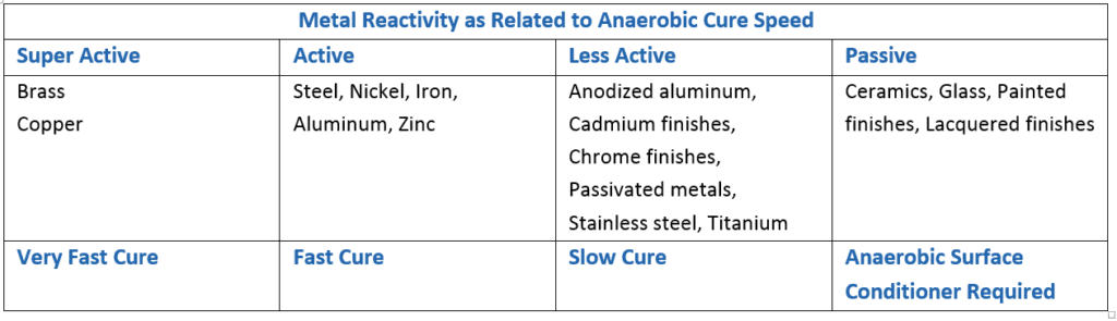 Anaerobic adhesives and sealants cure only in the presence of metal ions. Therefore, the more active the metal – the faster the cure rate. See the examples below.