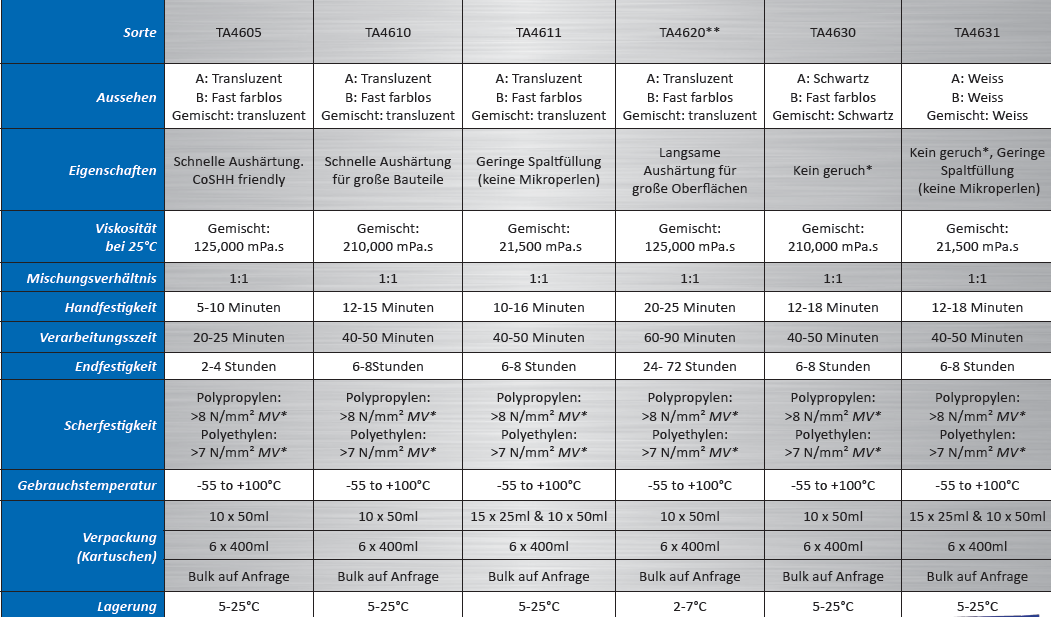 Permabonds TA46XX-Sortiment von strukturellen Acrylatklebstoffen bietet eine hervorragende Leistung auf allen oben genannten Polyethylenarten. Dazu gehören Permabond TA4605, TA4610, TA4611 und TA4631. Einige der wichtigsten Vorteile der Verwendung dieser Produkte sind Folgende: